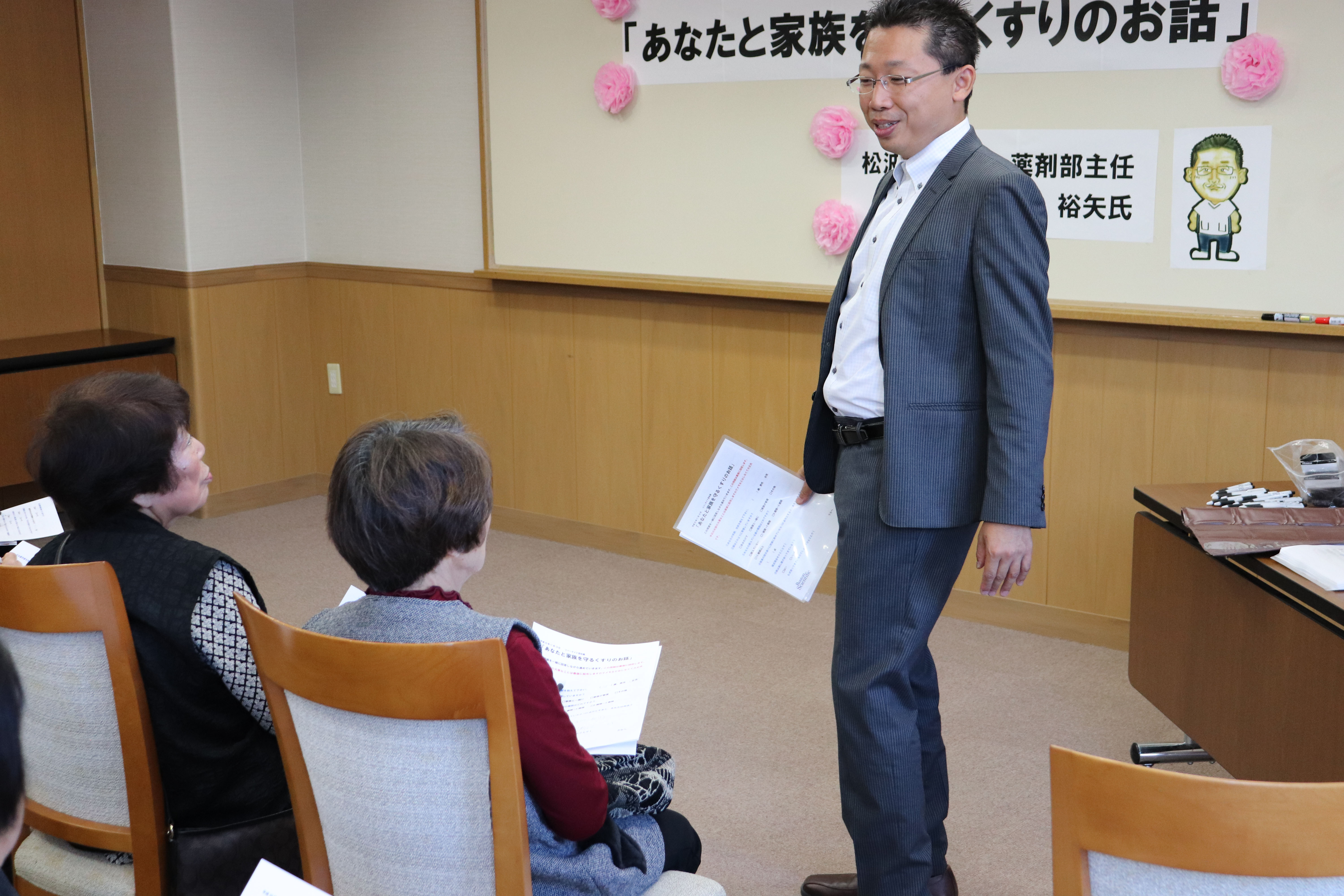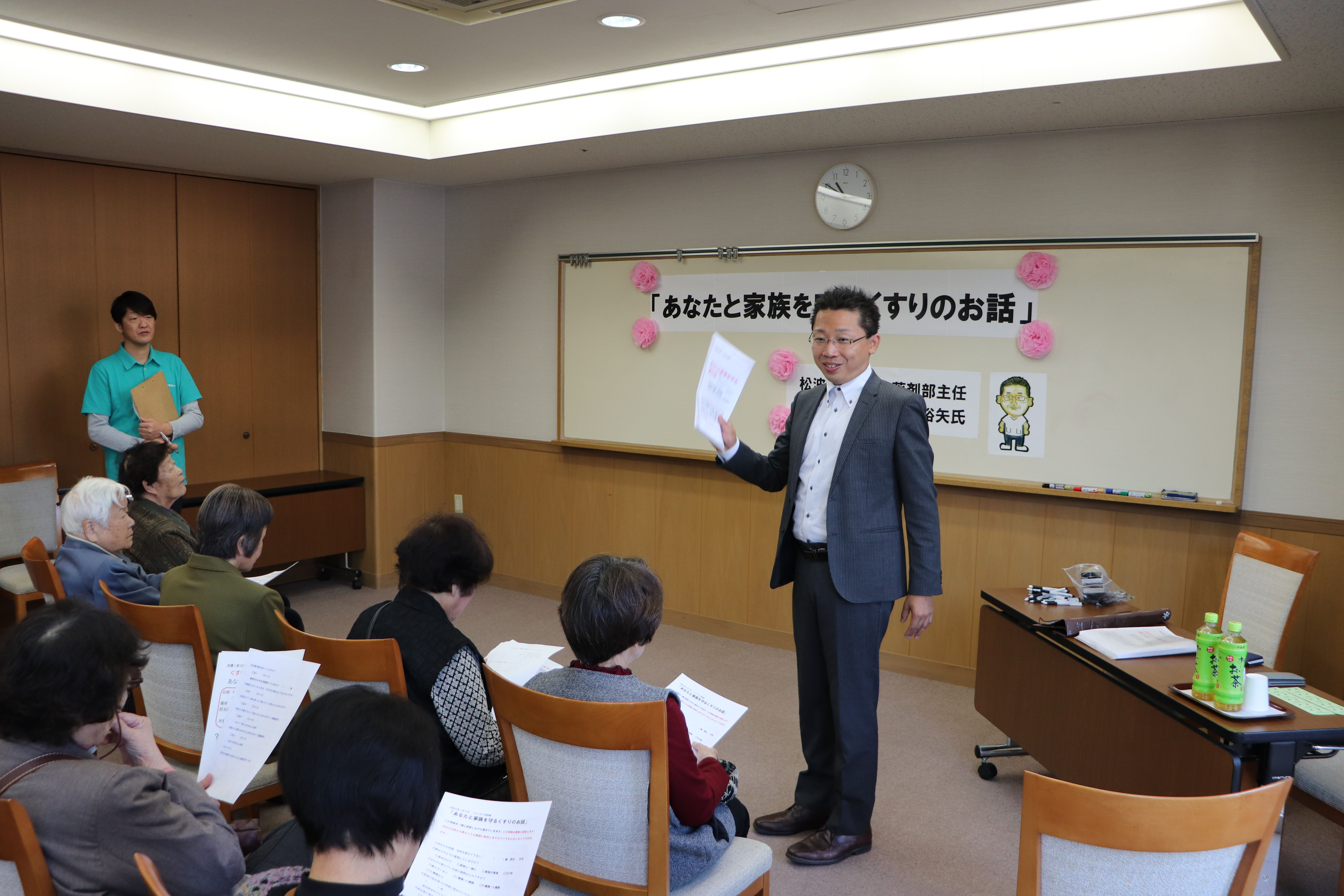 長谷川主任お手製のテキストをもとに、服薬の方法、薬の粉砕の禁止について、お薬手帳の大切さ、他人からの薬の受け取り禁止など聴講者だけでなく、聴講者のご家族にもぜひお伝えいただきたい服薬の注意点を中心に公演しました。聴講者の方が、テキストにメモをとってくださったり、講演後に長谷川主任に相談に行かれるなど熱心な方が多かったです。