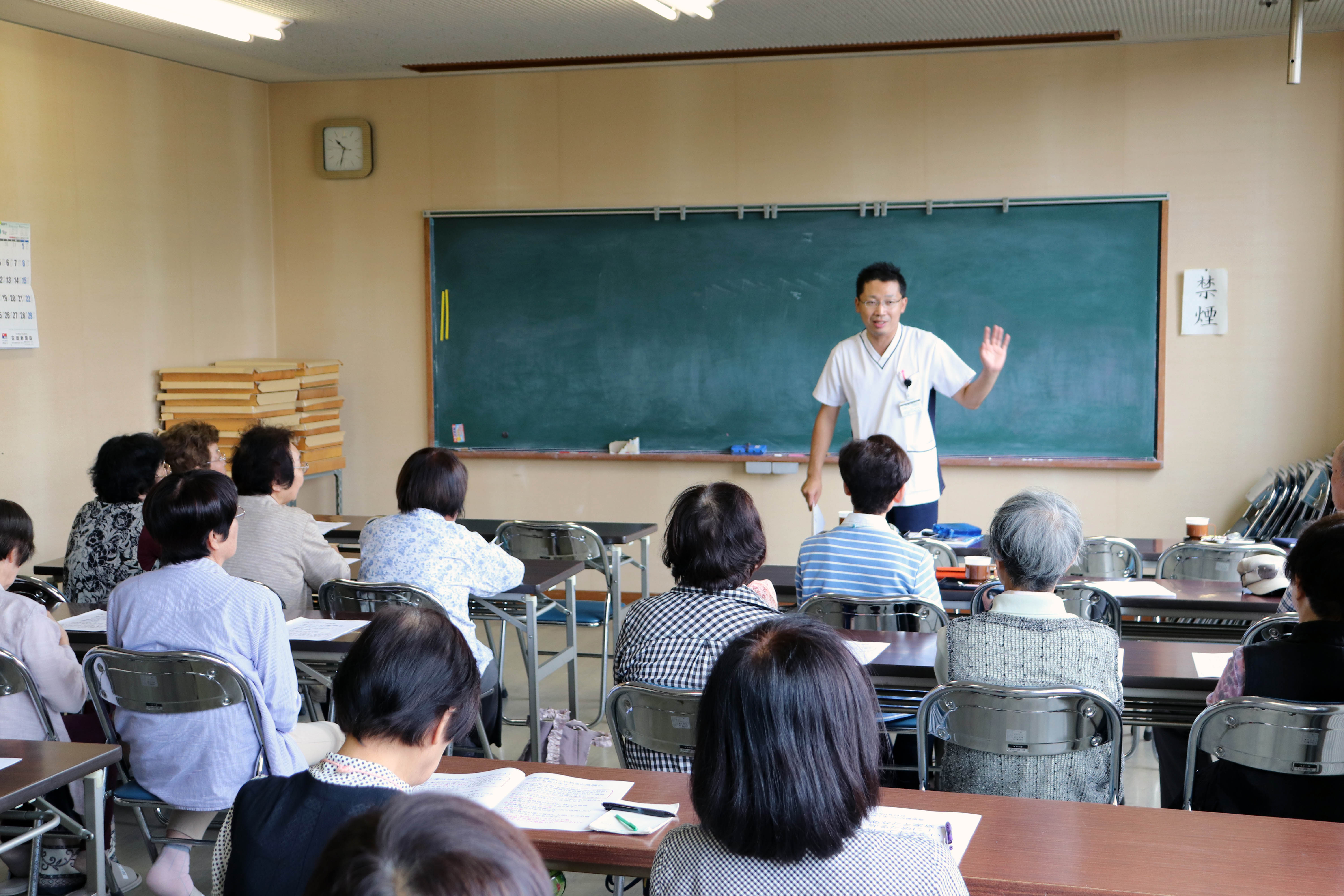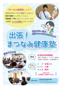 地域の皆さまに病気や医療のことをもっと知ってもらい、いつまでも健康でいられるよう、当院の医師、看護師、薬剤師、理学療法士、管理栄養士などの医療スタッフが講師となって、病気の早期発見や治療に役立てていただくことを目的に、出前講座「出張!まつなみ健康塾」を開催しています。
