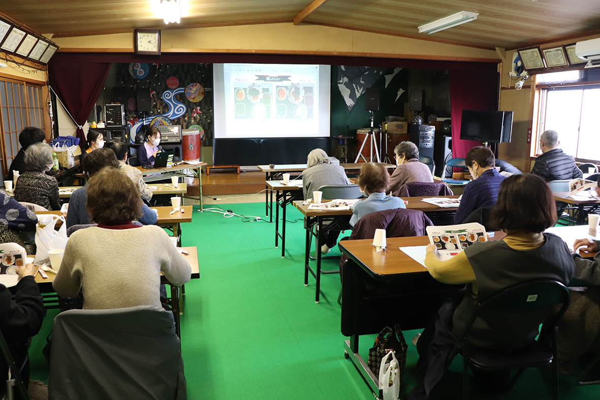 「今日からできる!生活習慣改善のヒント」と題して、普段の食生活の傾向についてや理想的な食事バランスなどについて、講演しました。熱心にメモを取って、聞いてくださる方もいました。