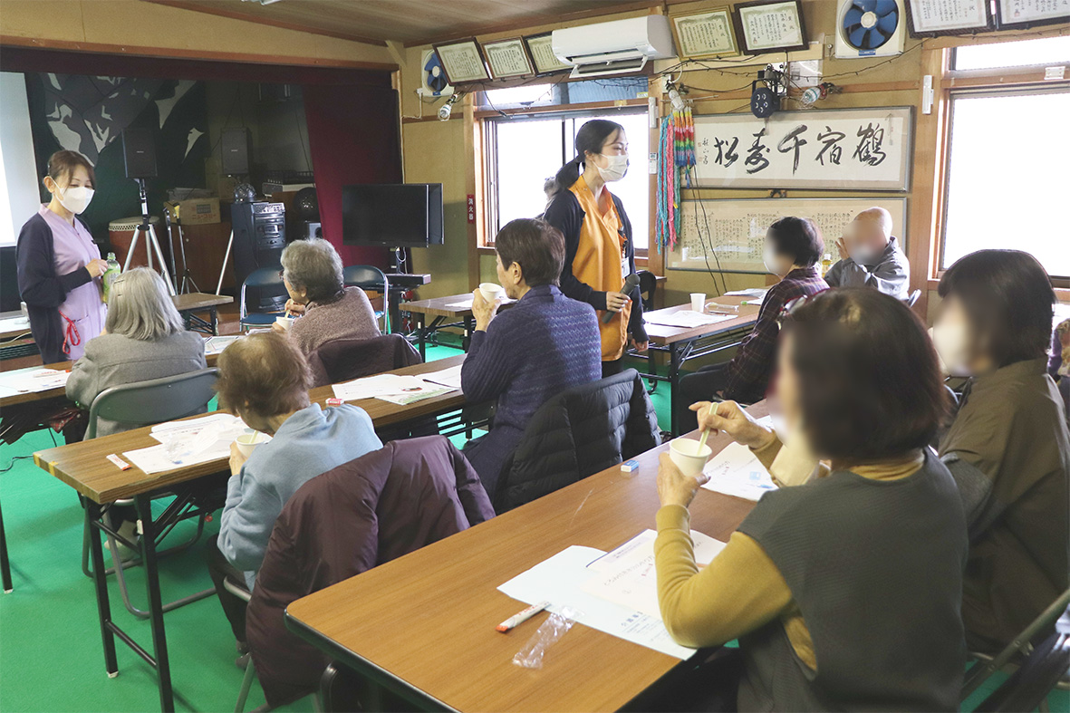 2024年度4回目のまつなみ健康塾は「不和一色サロン」へ出張し、歯科衛生士と管理栄養士によるオーラルフレイル対策!健口体操のすすめともりもり食べて健康長寿について講演を行いました。口腔や食事のことなど実践も加えながら講演しました。