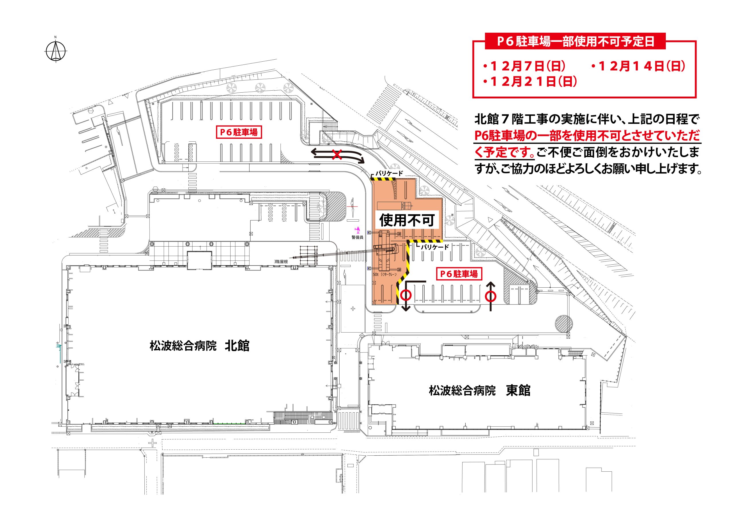 北館7階工事の実施に伴い、下記の日程でP6駐車場の一部を使用不可とさせていただく予定です。