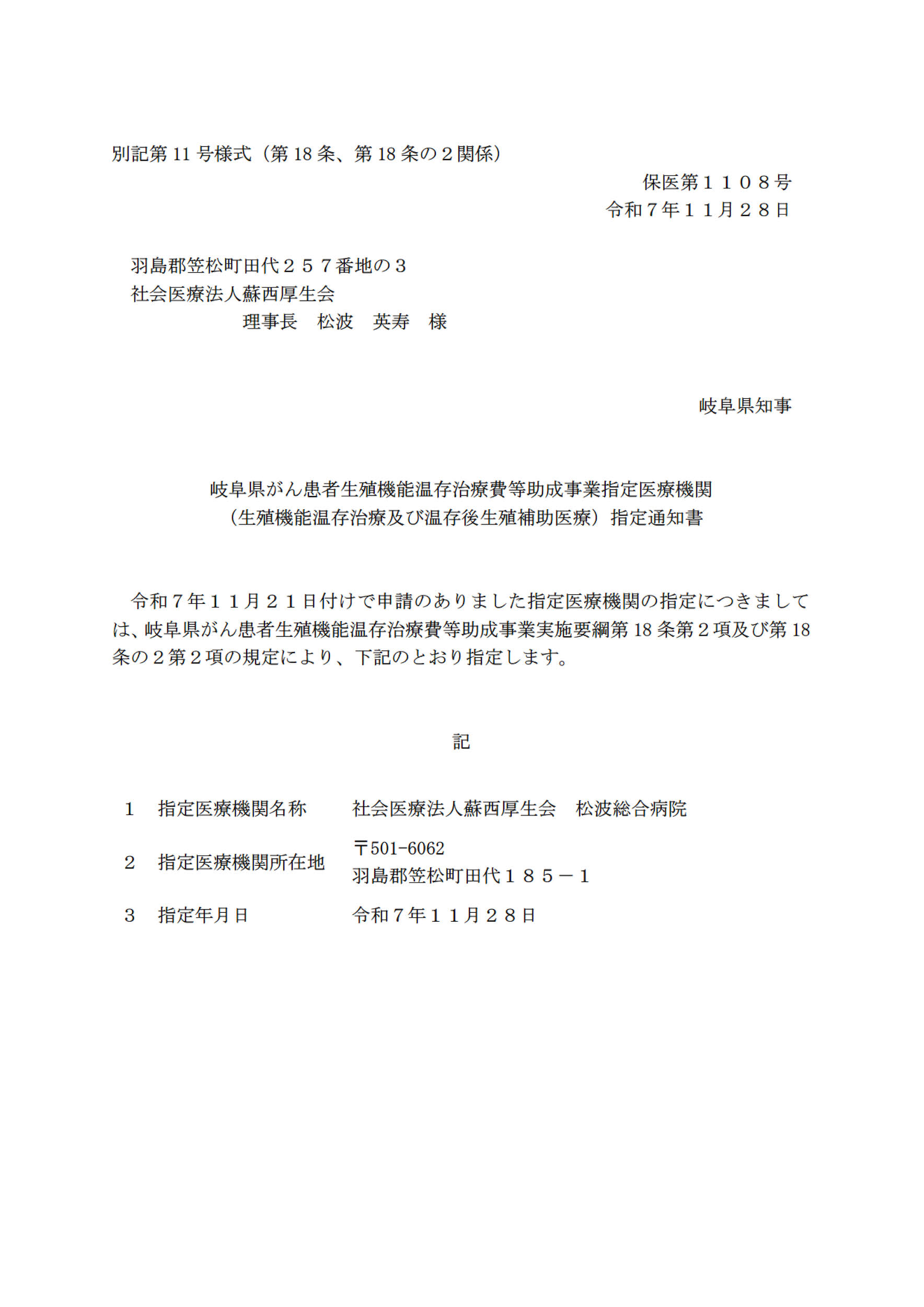当院は、令和7年11月28日で「岐阜県がん患者生殖機能温存治療費等助成事業指定医療機関」の指定を受けました。