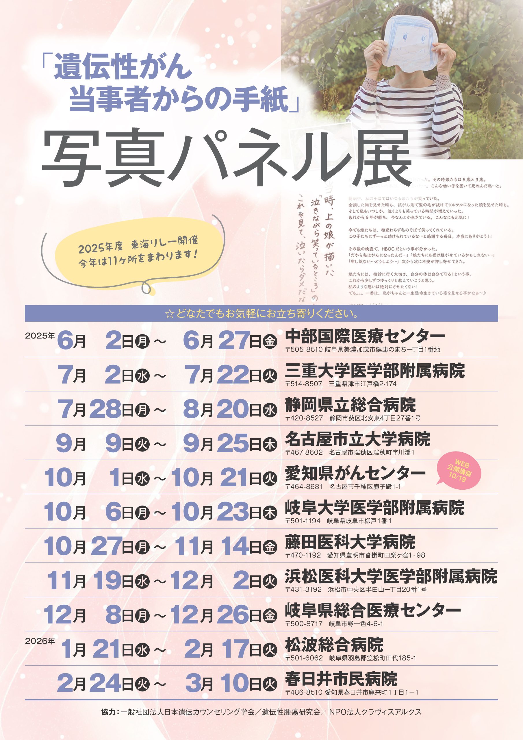 この写真パネル展は、遺伝性乳がん卵巣がん当事者会である特定非営利活動法人クラヴィスアルクスによって、当事者の声を広く社会に伝えることにより、社会啓発、遺伝医療への貢献、当事者の立ち直り支援、潜在的当事者へのエールを目的に、2018年から全国各地で開催されているものです。
