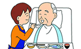 | 身体の麻痺や体力の低下などで、お箸やフォークが口元まで運べない、食器を持ちにくい、むせやすい方へ、食事をとったり、飲み物やお薬を飲むのをお手伝いをする介助をおこないます。 | ![]() |