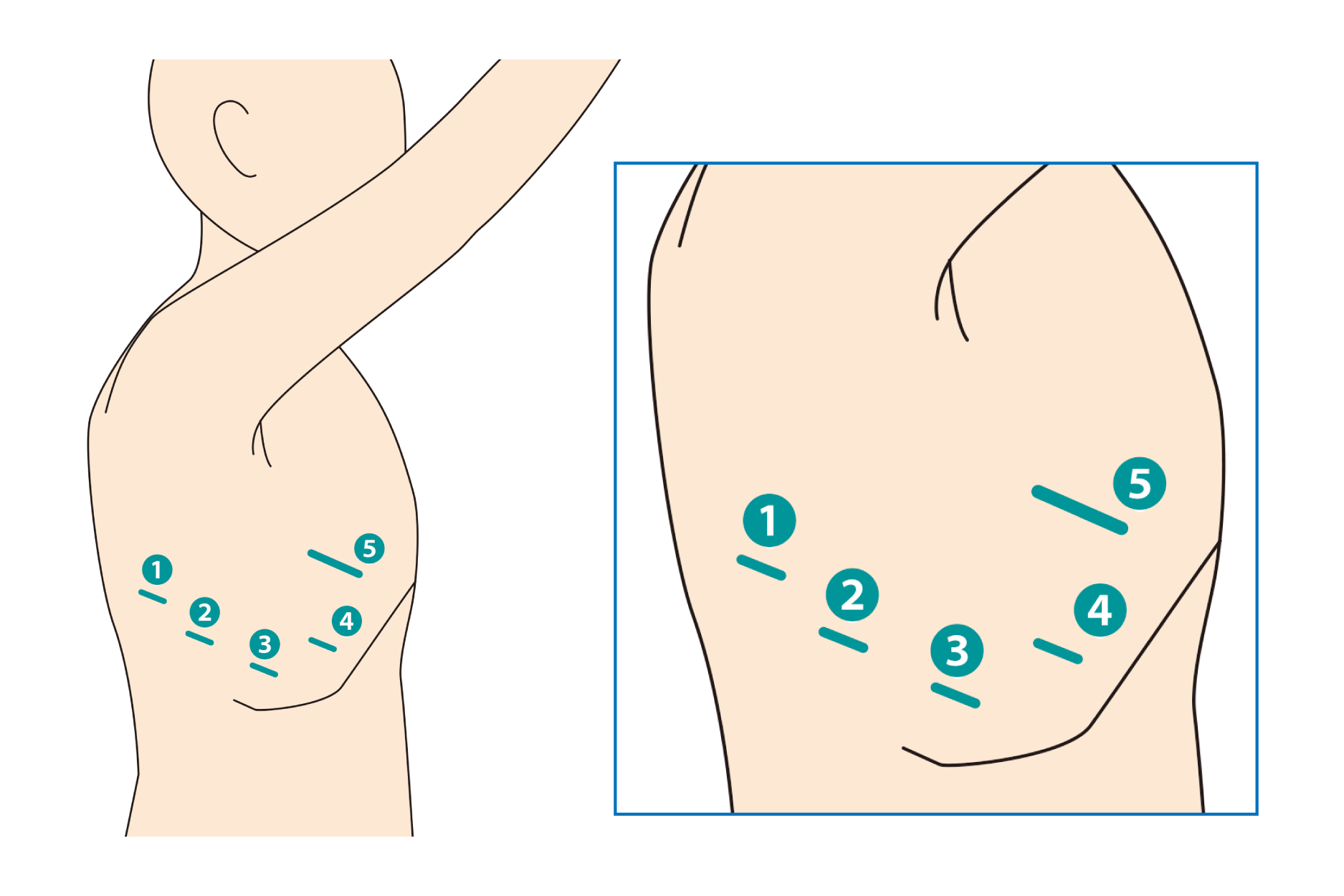 手術は、図の如く3-4cmの皮膚切開1箇所と1-2cmの皮膚切開4箇所で行います。